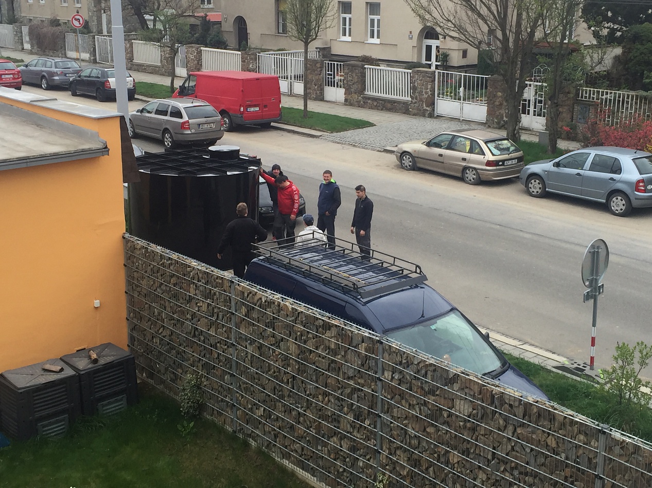 PS Nic nebylo snadné. Přes naše troleje nemohl nádrž umístit jeřáb na určené místo, ale zastoupila ho desítka chlapů a šikovně postavená dodávka. Naší asistentce zničili tažné lano, ale sami se nezabili, nádrž nerozbili. Včerejší dramata jsou dnes legrace. Pojďte nás následovat!